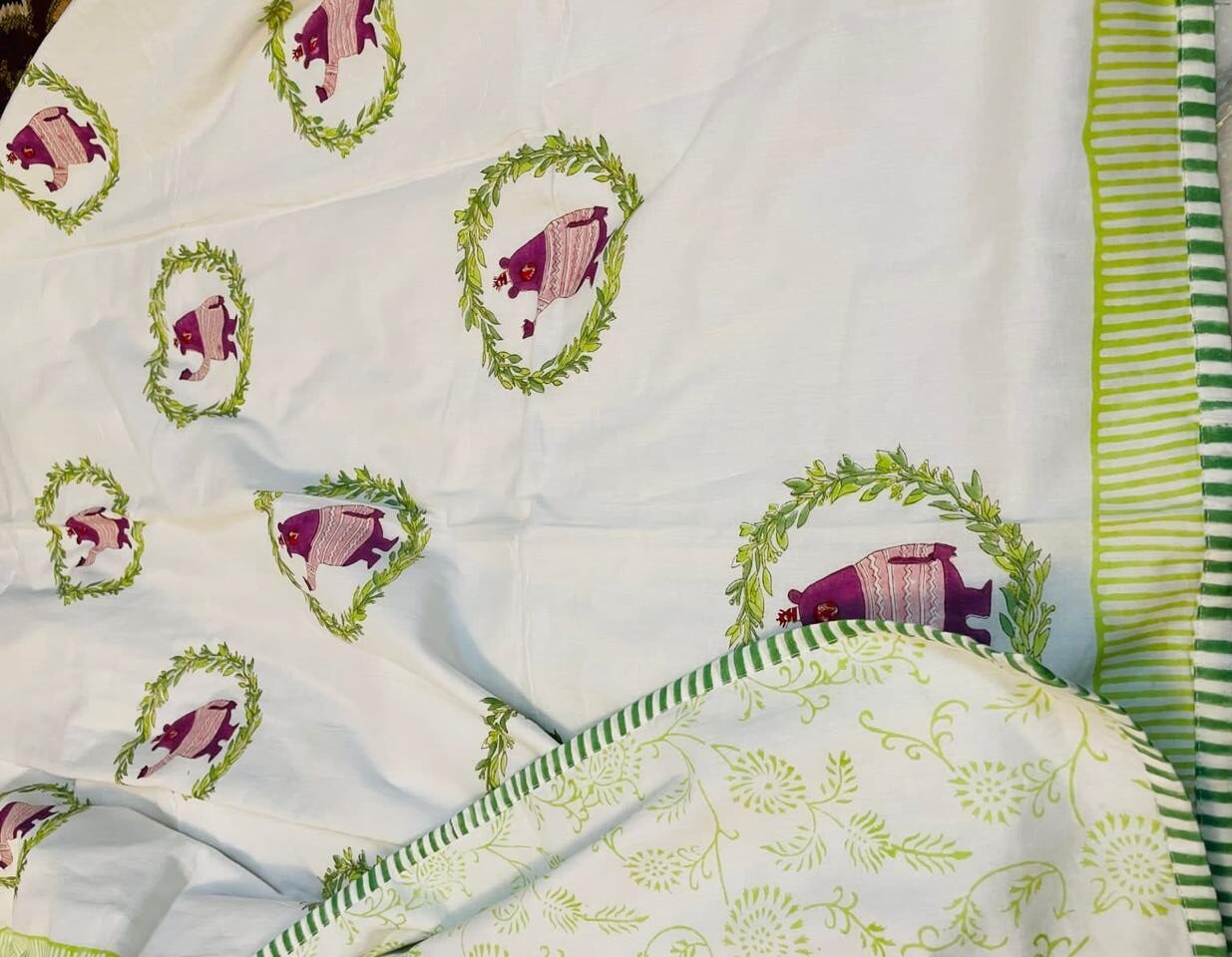 Wrap your little one in comfort and style with this adorable cotton hand block printed baby dohar. The front side features charming purple bears in cozy sweaters, encircled by leafy green wreaths on a white base. The reverse side has a soothing green floral print, making it a versatile addition to your baby’s bedding. The green striped border adds a playful touch while maintaining a neat finish.