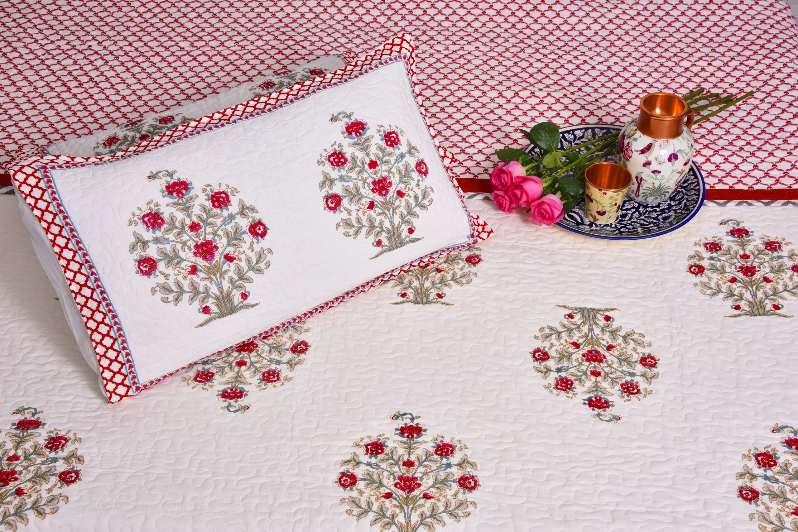 A luxurious 100% cotton quilted bedcover with 300 TC, cotton filling, and embroidered red floral patterns. It provides cozy comfort, breathable feel, and enhances bedroom aesthetics with traditional craftsmanship.