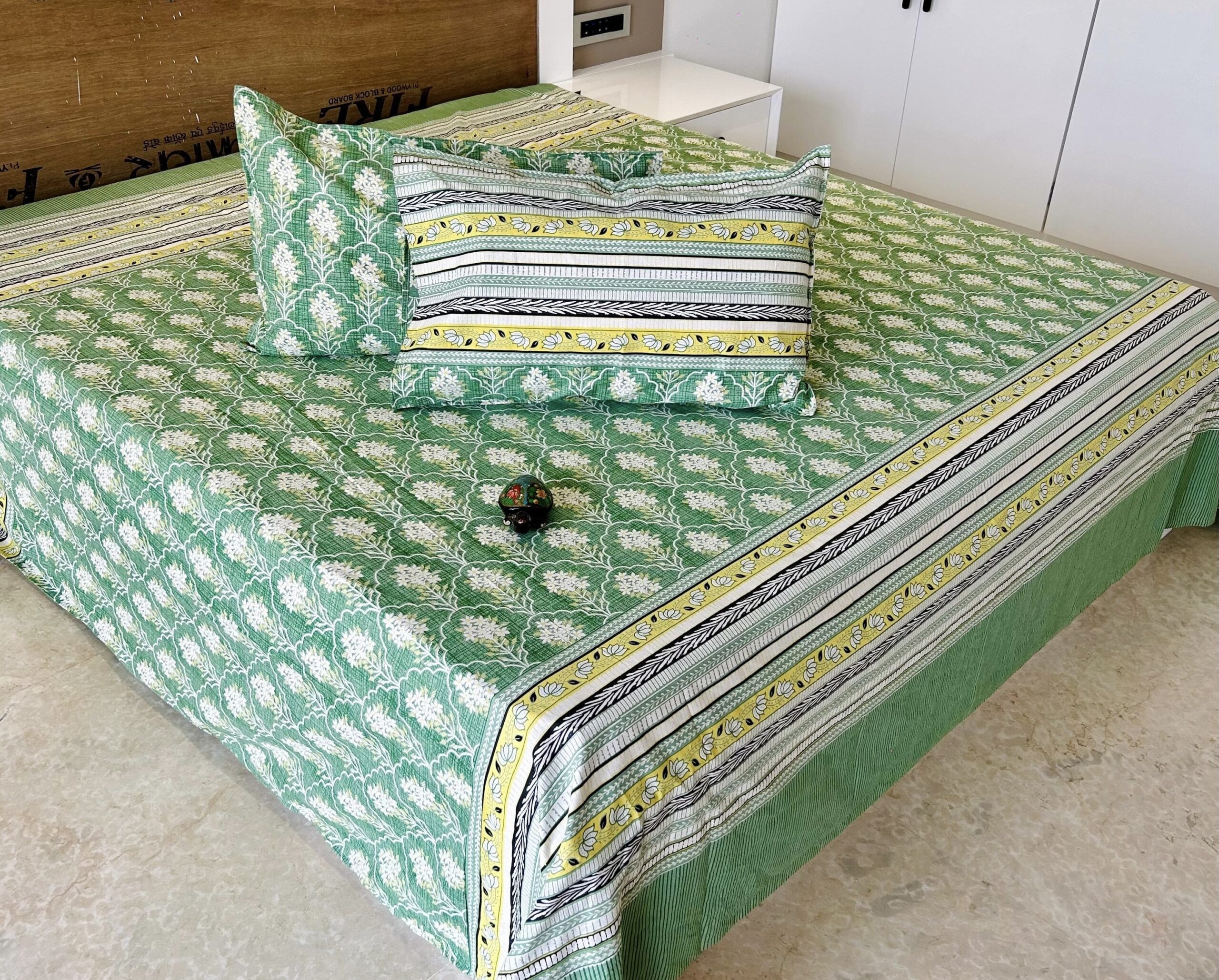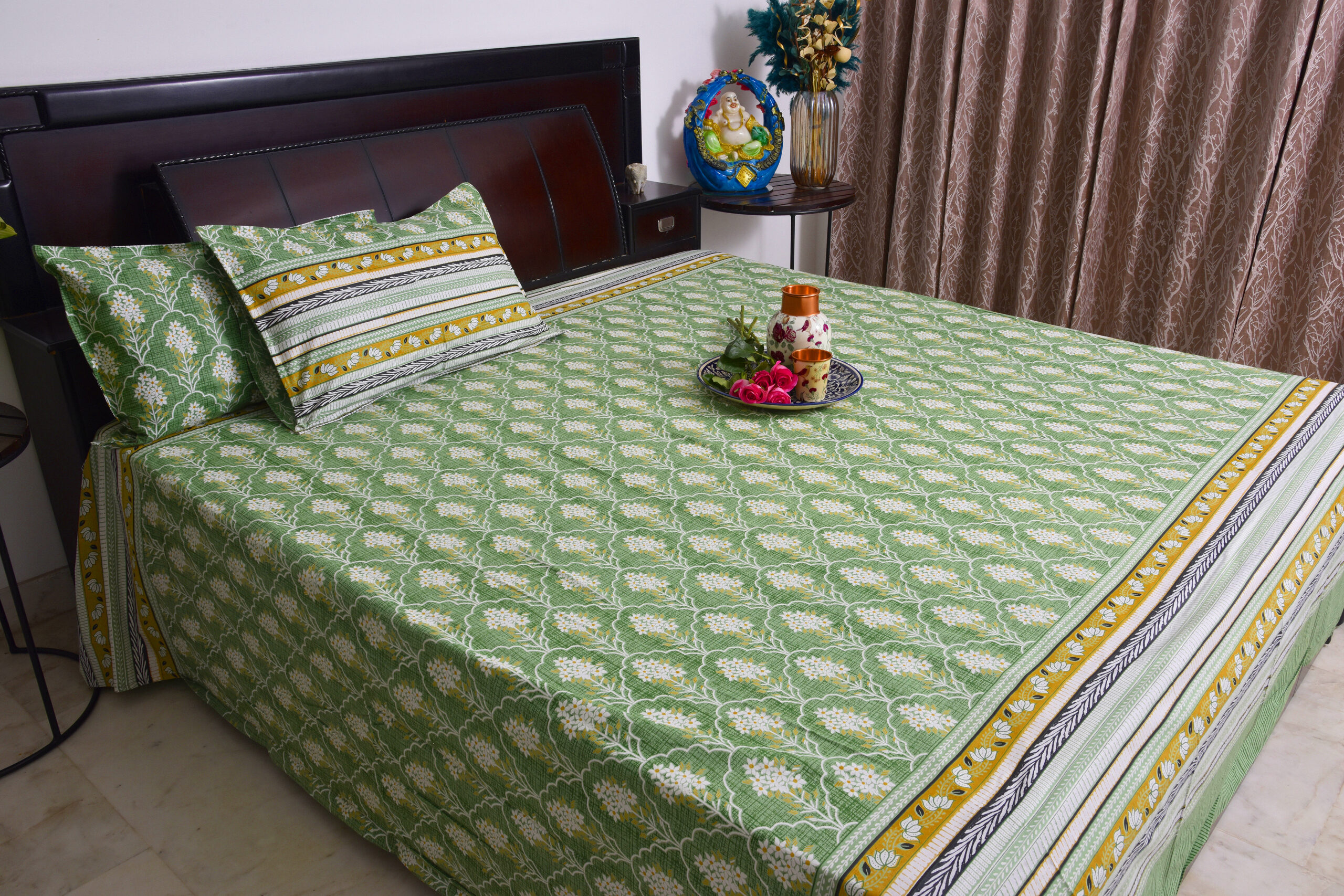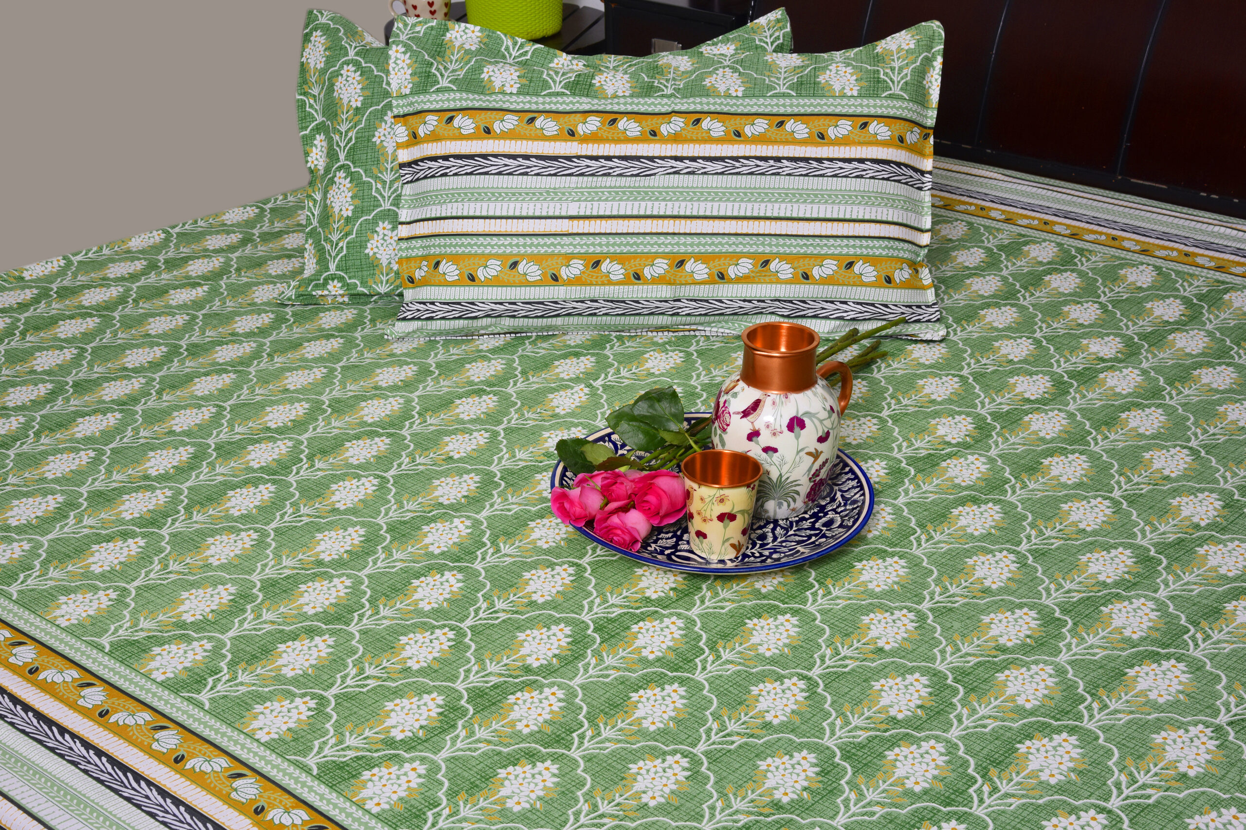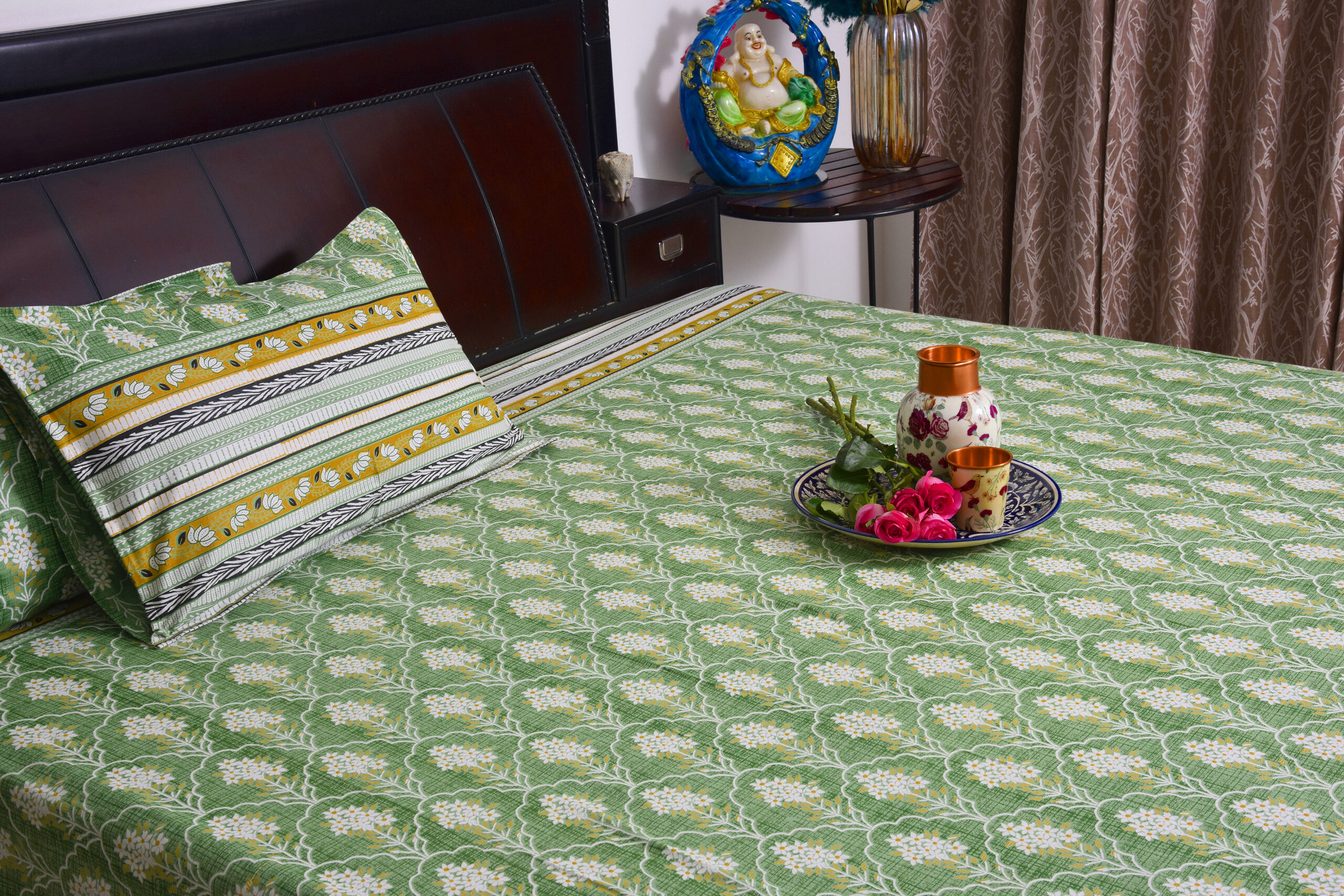This leafy green coloured bedsheet with all-over white buti motifs brings freshness of nature into your bedroom. Design of the bedsheet makes it stand out by giving it a refreshing and elegant appeal. Border of the bedsheet has yellow, white and black stripes that features floral and leaf designs giving your room a traditional charm. This soft cotton bedsheet comes with matching pillows that has coordinated patterns and detailing at the border.