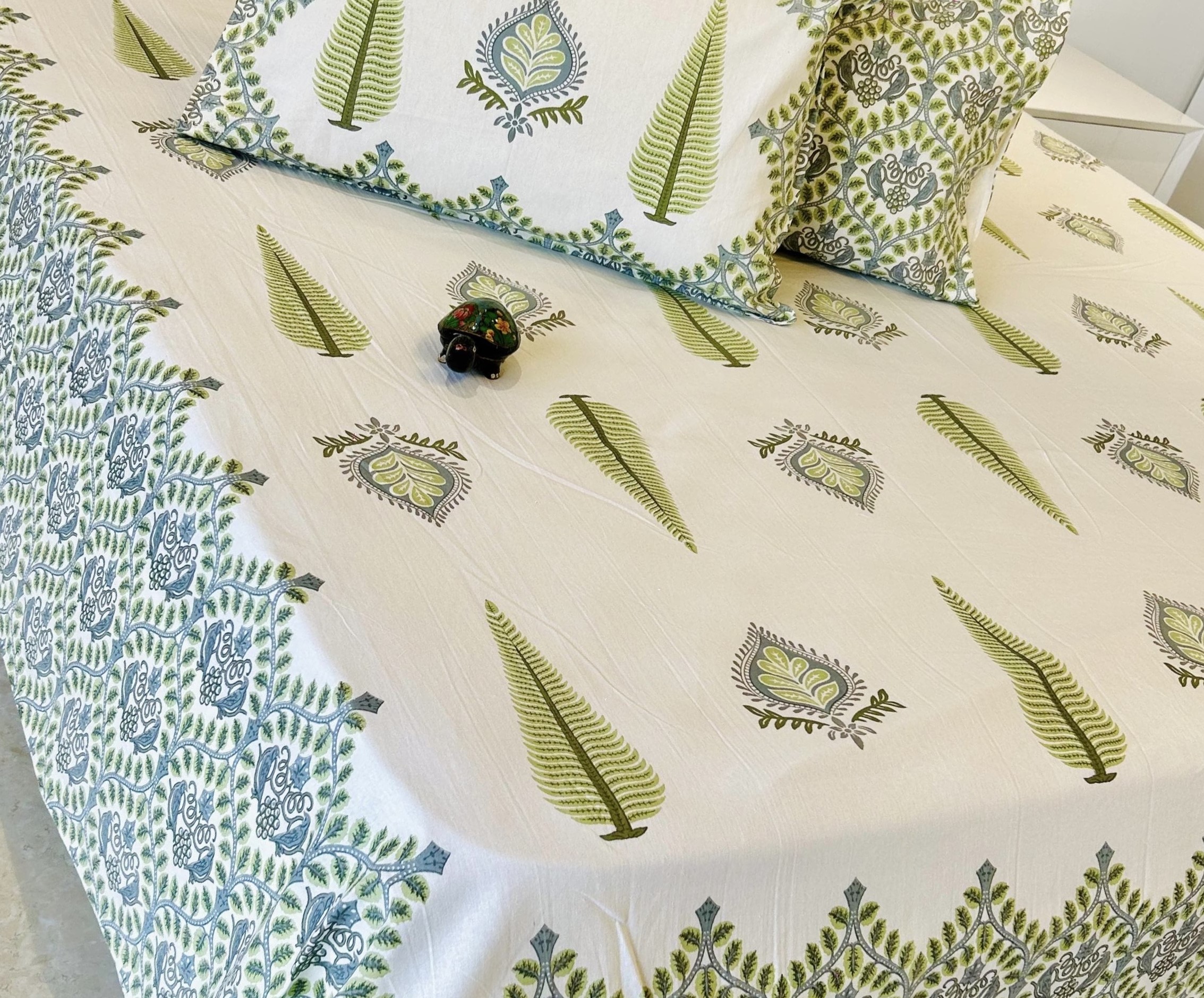 This beautiful bedsheet available in two colours showcase white base bedsheet with screen printed motifs in different shades. You can give your bedroom a balance of traditional charm and modern aesthetics with this bedsheet. Tree-life patterns and floral detailing has given a nature inspired look to the bedsheet. Rich decoration with dense floral prints is there on the borders that enhances the overall appearance of the bedsheet. Add a fresh, earthy vibe to your bedroom with this bedsheet to ensure comfort and style.