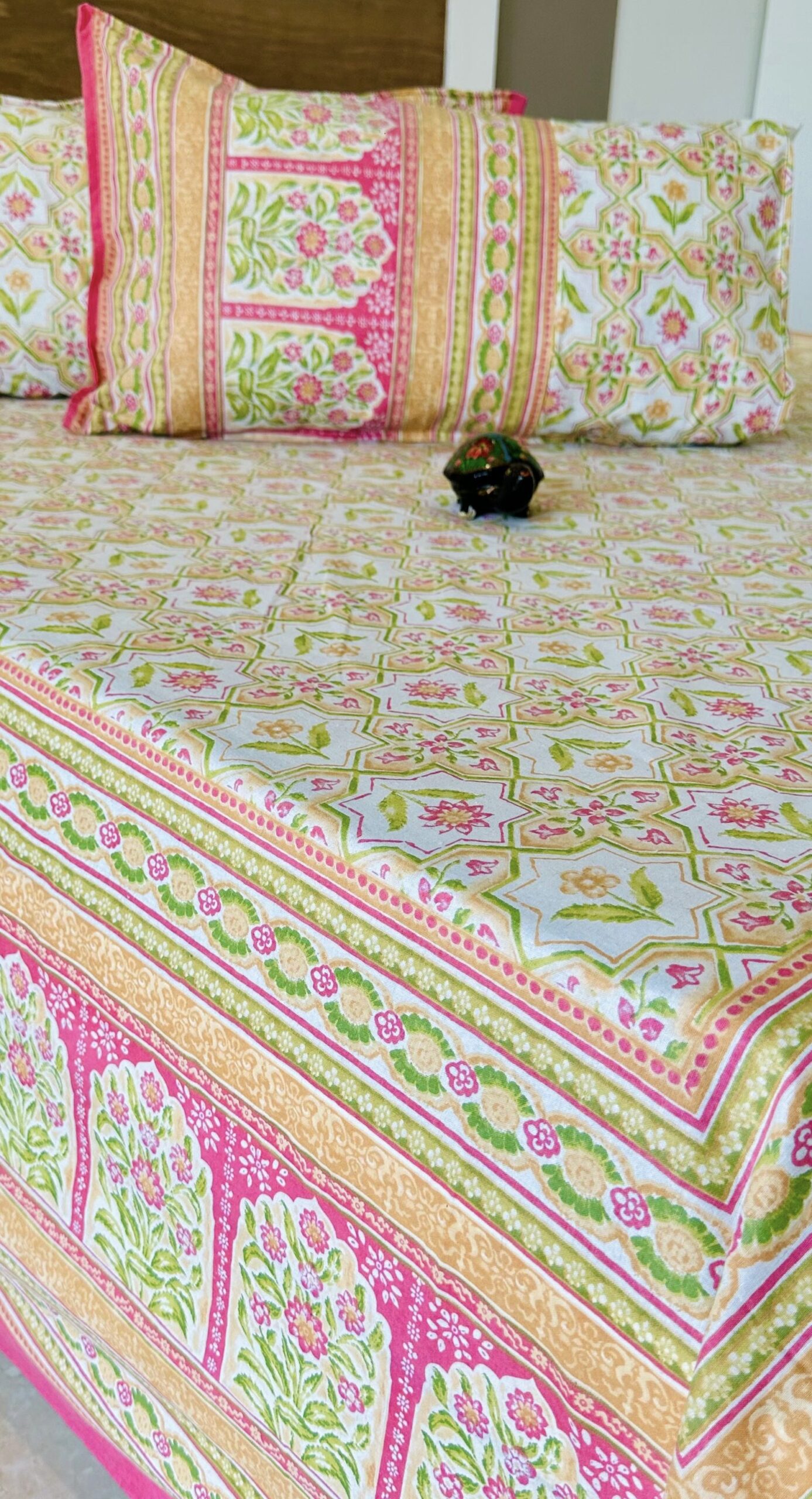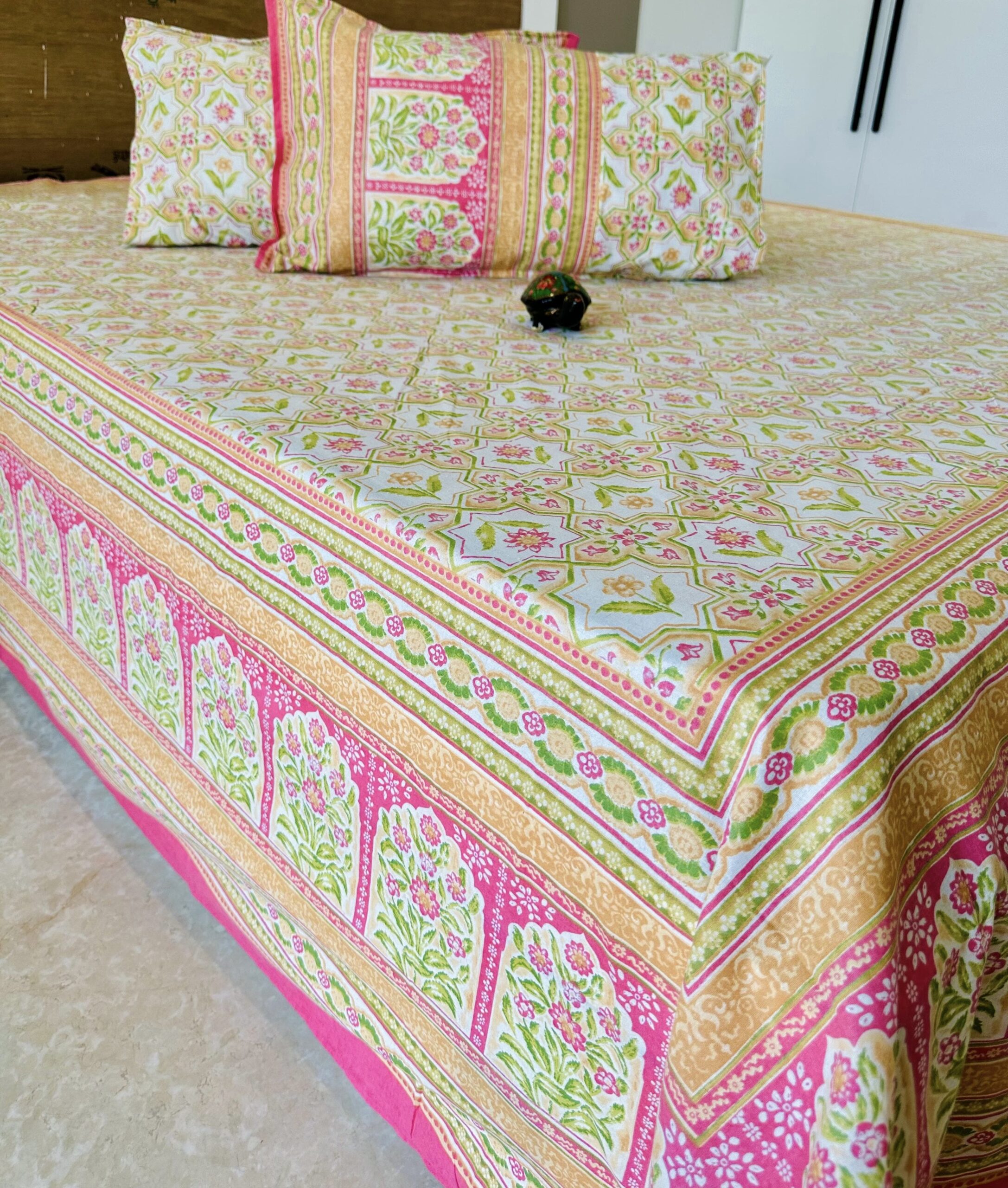 | Colour and Pattern | Pink, Green and Golden Yellow colour bedsheet with pattern of floral tiles |