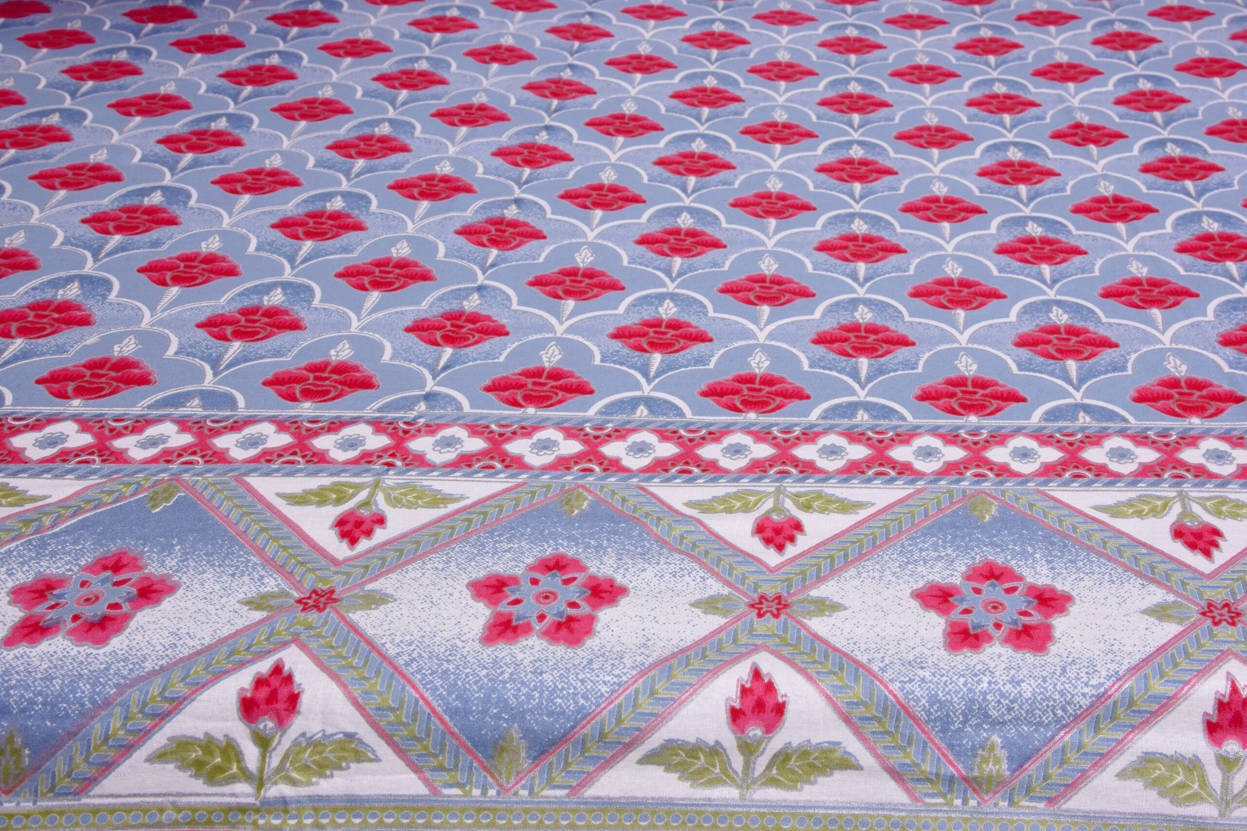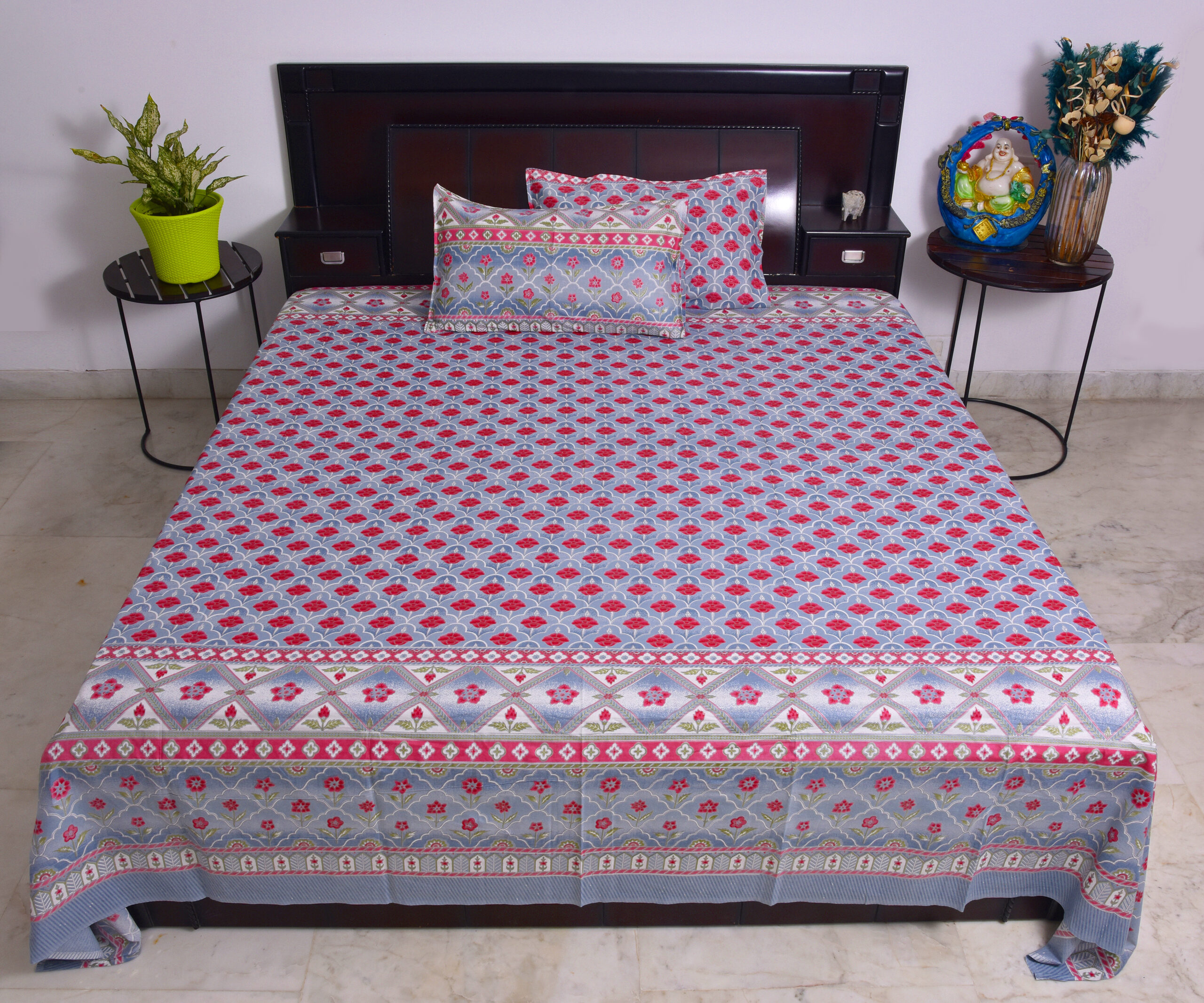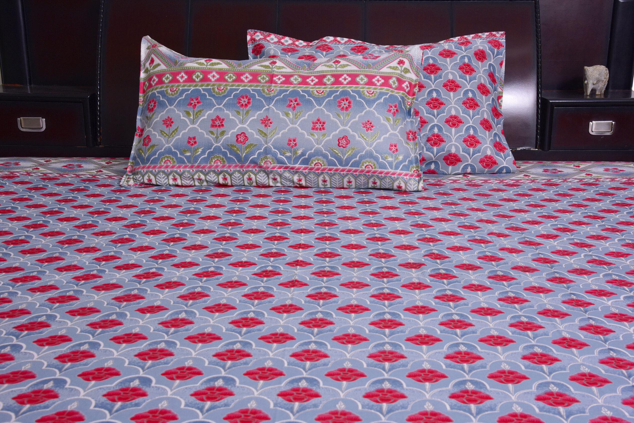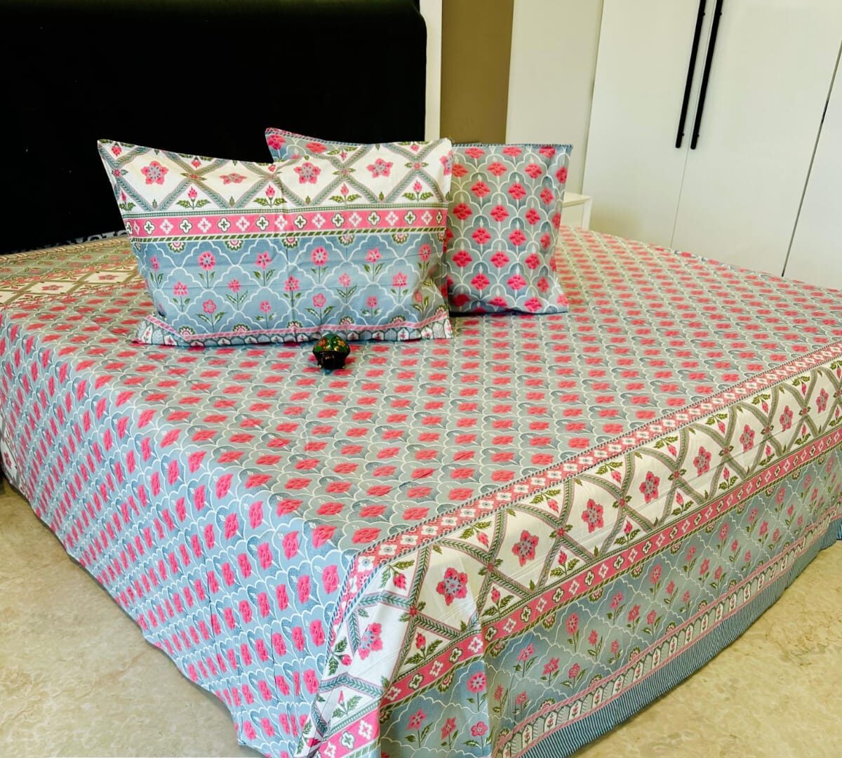 Elevate your sleep space with this luxurious king‑size bedsheet (108×108 inches) featuring a stunning pink‑blue floral lattice design. Crafted from soft, breathable pure cotton, it comes with matching pillow covers (18×28 inches). Perfect blend of traditional charm and modern comfort for your bedroom retreat. The vibrant pink blossoms and soothing blue patterns add a touch of elegance, making it ideal for cozy nights and stylish décor enthusiasts who love classic Indian prints.