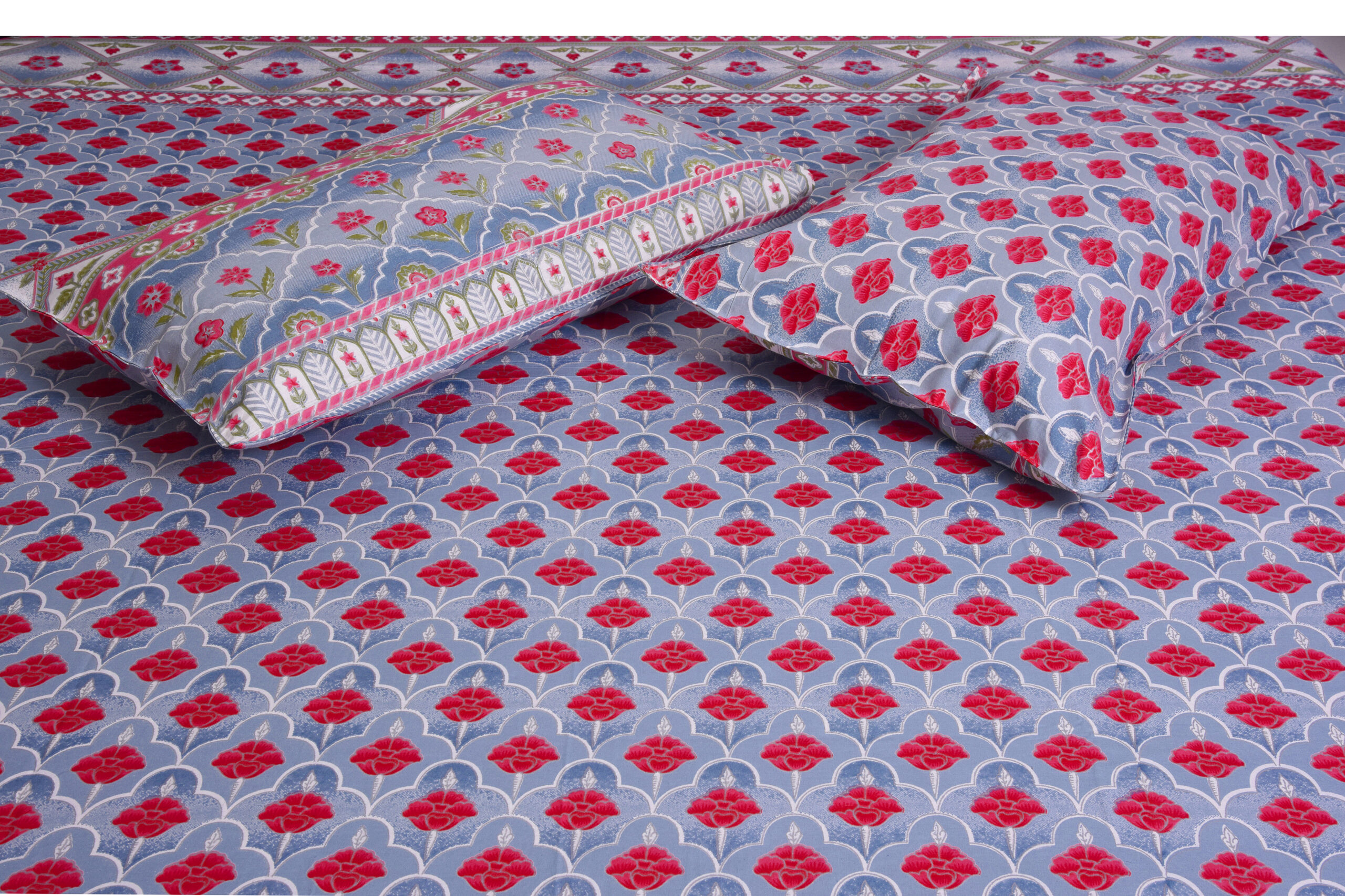 Floral Royale Bedsheet – a luxurious 108×108 inch king‑size bedsheet featuring an elegant pink‑blue floral lattice design with matching pillow covers, perfect for adding a touch of traditional elegance to your bedroom, inspired by the vibrant pink blossoms and soothing blue patterns shown in the product image.