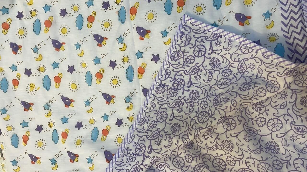 Wrap your little one in comfort with this beautifully crafted cotton hand block printed baby dohar. The front side features a fun and colorful space-themed print including stars, moons, rockets, suns, clouds, and planets—perfect to spark imagination during bedtime. The reverse side showcases a soothing purple floral block print, adding elegance and versatility. This reversible dohar can be used from both sides, is 40 x 60 inches in size, has a 200 GSM filling for light yet cozy warmth, is suitable for kids up to 0–5 years, and is made of ultra-soft mulmul cotton that’s gentle on baby’s skin.