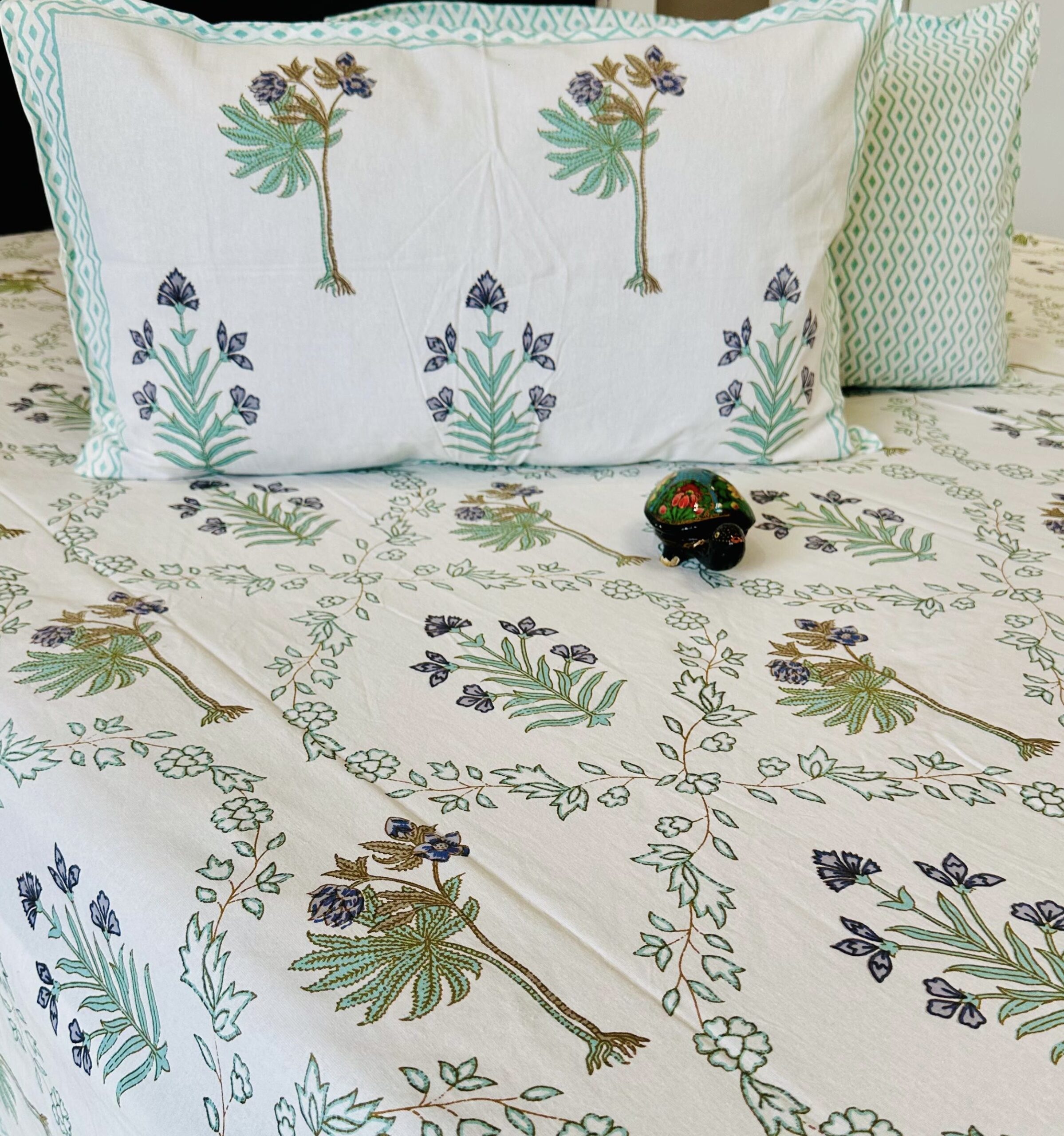 Our Vanlata bedsheet has delicate and refreshing floral design inspired by tranquillity of nature. This screen printed bedsheet has a soft white base and is available in two colours. Elegant palm trees and floral designs are printed on the bedsheet which is perfect for those who appreciate nature and looking for artisanal detail in their home decor.